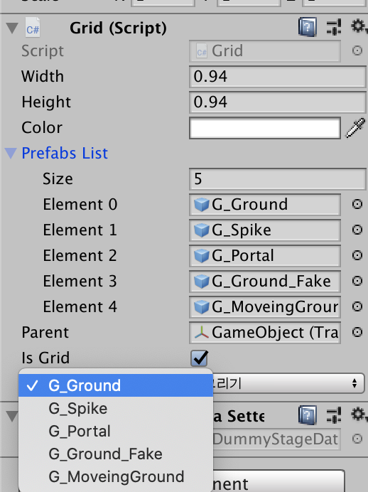 다 완성됐다면 이렇게 prefablist 프러퍼티에 오브젝트를 넣어주면 해당 오브젝트들이 나올것 입니다. 그것을 선택하고 씬뷰에서 클릭, 드래그를 이용해서 타일맵을 제작하면 되겠습니다.