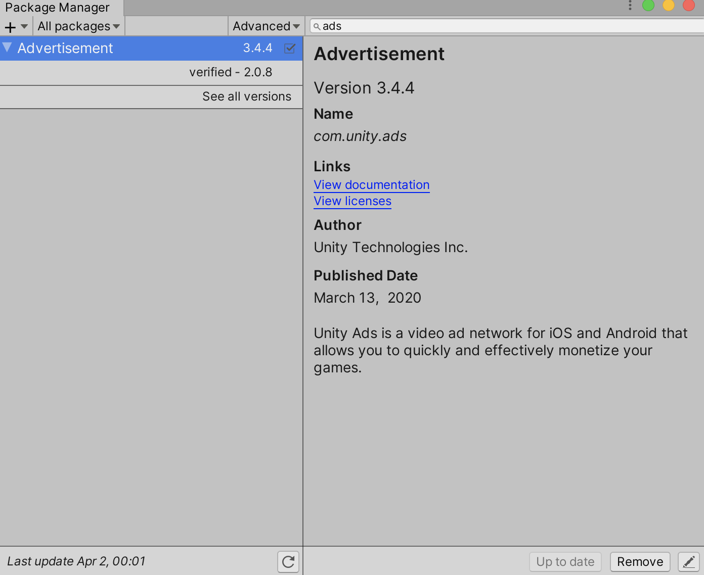 여기서 Advertisement가 빨간줄로 안되는 경우나 Advertisement.IsReady가 false로 뜰 경우에는 패키지 매니저에서 ads업데이트 시켜주시면 될것같습니다.